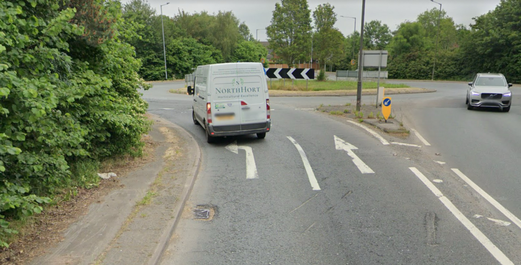 Roundabout near the pure gym in Northwich, it has multiple lanes, junctions with and without traffic lights however the exits are clearly marked on the approach and on the road.